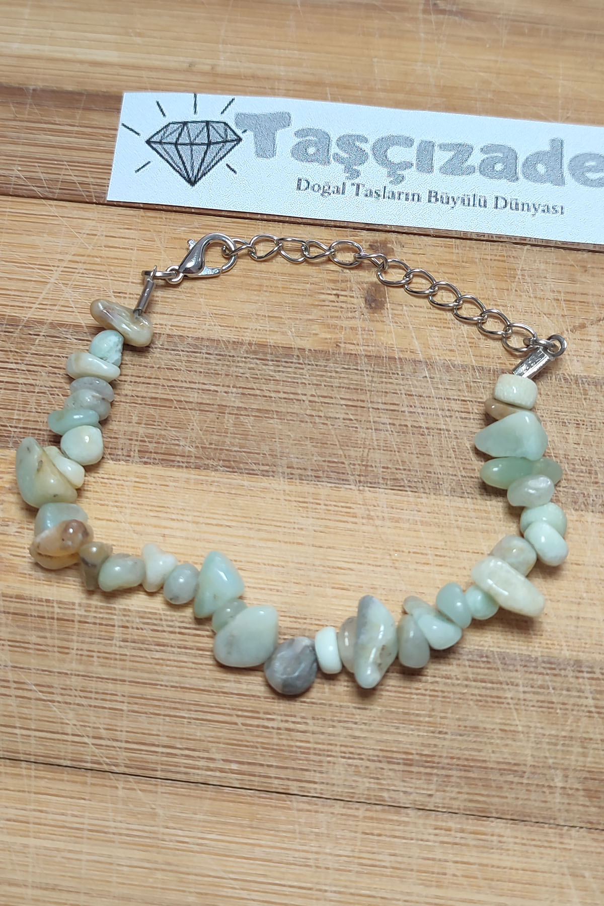 Ortalama aparat dahil 18-19 CM uzunluğa sahip yeşil amazonit taşlı doğal taş bileklik doğal şekilsiz kırık taştan tasarlanmıştır. |